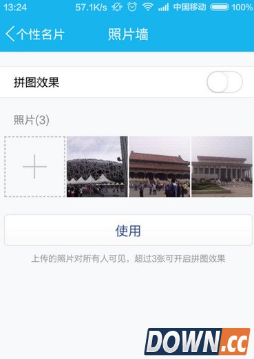 9、接下来,请大家点击界面中上方出现的“拼图”按钮,使拼图功能处于开启状态,然后软件将自动执行拼图操作,我们点击最下方的“使用”按钮,使用当前的照片作为照片墙,然后就可以自动保存设置了。