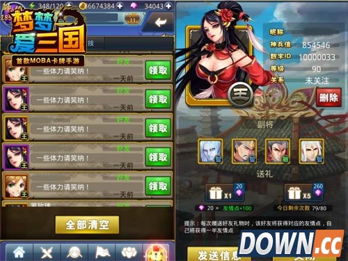 【聊天送礼互动有奖】 有了朋友也要多多互动,巩固好朋友关系,一起聊一聊天、探讨一下新出的武将应该跟谁搭配,这都是最基本的啦。《梦梦爱三国》好友系统不仅可以查看好友信息、与好友聊天,更有独特的“友情点”系统,成为好友之后,可以通过向好友送体力或送礼物的方式获得友情点。