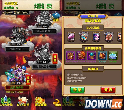 【公会副本DKP计分系统 赢取功勋竞拍极品奖励】 有公会,就是不一样!可以挑战更加强力的公会副本和BOSS,赢取更高级的奖励!情迷白骨洞、恶斗海龙宫、决战南天门……九大章节公会副本等你来挑战,每个公会成员每天可挑战3次,在限定时间内通关,还可以获得额外奖励。必须通关前置关卡,才能继续开启下一章节副本,副本BOSS和怪物的攻击和血量都很硬,打起来比较有难度,必须集合公会全体成员的力量一次又一次的进攻才能成功过关。 《大圣归来》公会副本采用时下最流行的端游团队副本DKP计分系统,将根据成员各自的战斗贡献获取相应奖励。挑战公会副本时,击杀副本BOSS可获得个人战利品和公会战利品,公会战利品将在公会市场进行竞拍,谁在特定时间内出的功勋高就能将大奖收入囊中。 同时,每通关一个关卡,根据DPS的累积伤害值,每天24时进行统计各成员伤害,并对应发放功勋奖励。如10000伤害值可获得360功勋,100000伤害值获得1800功勋。副本内怪物采用异步战斗方式,可以被多玩家依次挑战,并记录每个成员伤害数值,形成DPS榜单的伤害量排名。攻击力越高、打的次数越多,则问鼎榜单第一名的几率越大,成为公会最强英雄!