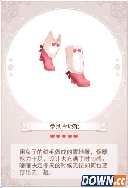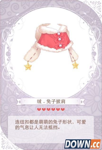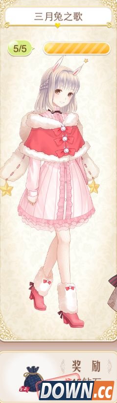 头发:樱色满园 三颗星 (商店购买) 连衣裙:草莓糯米糍 五颗星 (商店购买) 外套:绒·兔子披肩 六颗星 (商店购买) 鞋子:兔绒雪地靴 五颗星 (商店购买) 头饰:兔耳流星 三颗星 (任务成就领取)