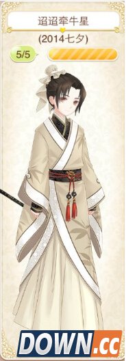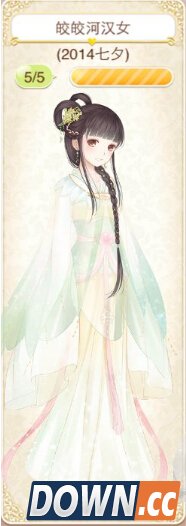 迢迢牵牛星套装获取方式: (2014七夕节微信转发达到七万所有人获得) 头发:温润君子 七颗星 连衣裙:迢迢牵牛星 七颗星 鞋子:汉河 七颗星 手饰:苍音 七颗星 表情:冠玉 七颗星 皎皎河汉女
