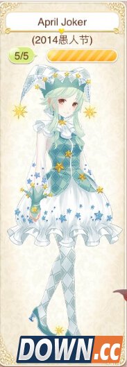April Joker套装获取方式: (2014年愚人节任务小丑盒子兑换) 头发:绿松石 七颗星 连衣裙:愚者 七颗星 袜子:菱格迷宫 七颗星 鞋子:北极星 七颗星 头饰:满天星 七颗星 吉运锦鲤