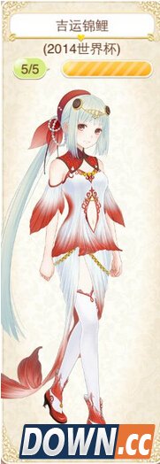 吉运锦鲤套装获取方式: (2014年世界杯期间德国获胜赠送) 头发:吉运锦鲤 七颗星 上衣:锦鲤·福 七颗星 下装:锦鲤·高 七颗星 袜子:锦鲤·星 七颗星 鞋子:锦鲤·照 七颗星迢迢牵牛星