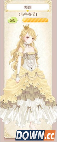 倾国套装获取方式: (幻之阁能否抽取待定) 头发:金粉世家 七颗星 连衣裙:黄金时代 七颗星 鞋子:甜蜜之梦 七颗星 头饰:金色皇冠 七颗星 颈饰:倾国·颈饰 七颗星 蜜恋