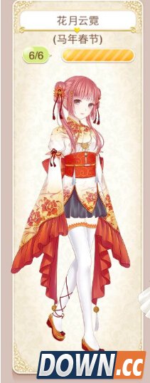 花月云霓套装获取方式: (目前已绝版,幻之阁能否获取不确定) 头发:花火 七颗星 连衣裙:金色莲华 七颗星 袜子:莲花步步生 七颗星 鞋子:芙蓉 七颗星 妆容:红莲·胭脂 六颗星 颈饰:长命锁 七颗星倾国