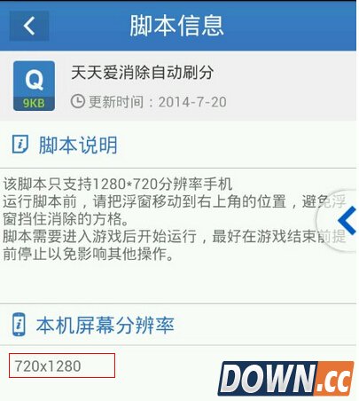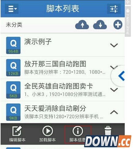 2、打开按键精灵后,会发现有很多脚本,随便点开一个脚本的“脚本信息”,会发现在最下面有“本机屏幕分辨率”将那里的数字记下了。
