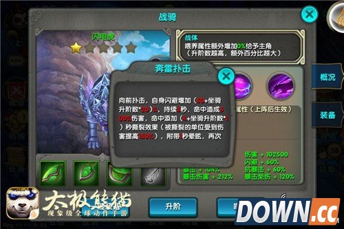 《太极熊猫》新版本“公会争霸”中,骑战系统无疑是最为出彩的,火麒麟在近日的巅峰王座中表现抢眼,不少玩家早早地将它收至麾下,可谓过足了团战瘾,而闪电虎和冰霜犀牛也有其独到之处。其中闪电虎在更新后,实力更显强劲,下面就详细解读一下《太极熊猫》战骑闪电虎。