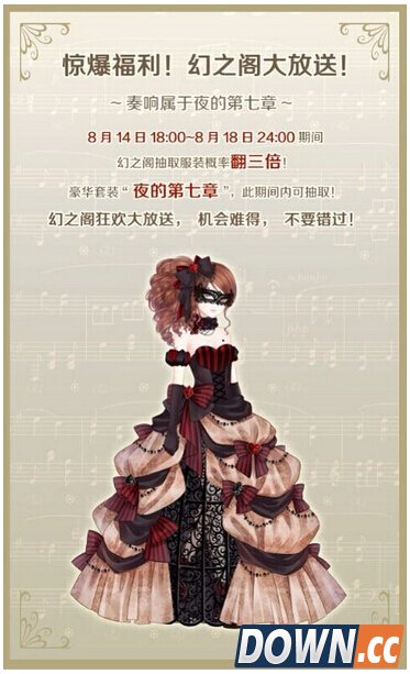 是不是异常的华丽和高贵漂亮呢!此次官方举行活动,参加活动就有几率获取这套华丽的“夜的第七章”噢! 【幻之阁大放送】 【活动时间】:2014年8月14日18:00-8月18日24:00