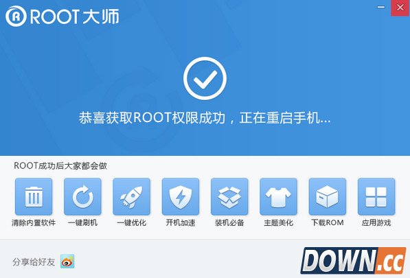 一般不超过5分钟,就会显示“ROOT权限已获取”,查看手机上多了一个root大师手机版软件就表示手机已经成功ROOT了,想ROOT的用户快自己试试吧。