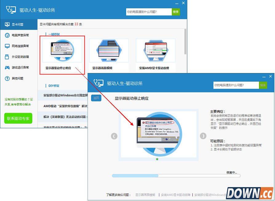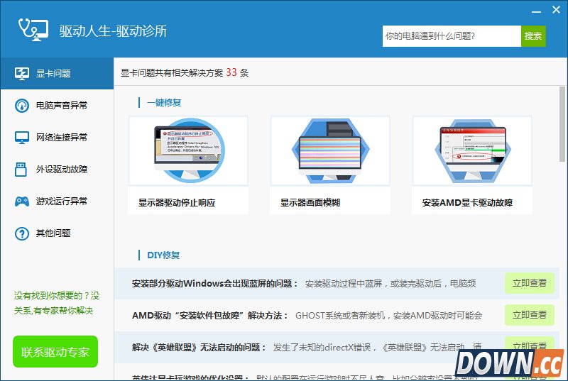 下面,小编以显卡问题为例来体验一下驱动诊所的功能。如果你的显示器 出现问题了,你可以先根据一键修复里的问题描述,来对应自己电脑的症状, 如符合描述,可以点击修复一键解决显示器问题。