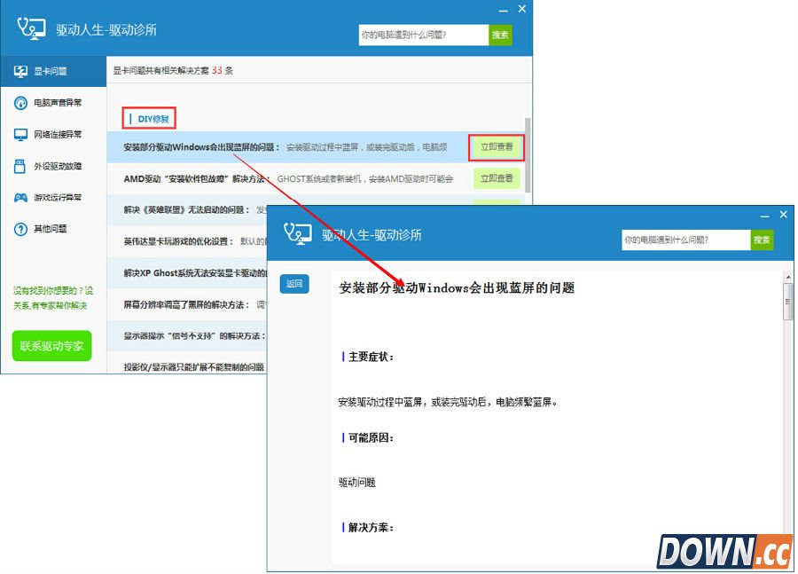如果一键修复的问题描述中没有你电脑出现的问题,你还可以选择DIY修 复。找到具体问题后立即查看,即可看到对于该问题的详细解决方案,按照解 决方案来解决具体问题,步骤清楚明了,通俗易懂,既能让你快速找到病症所 在并解决问题,还能给你带来DIY修复自己电脑的成就感。