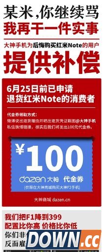 小米手机就是在微博营销起家,粉丝运营方式自然驾轻就熟,除了有奖转发之外,还会经常提示用户“转发2-3次获奖机会更大”,这种方法直接将转发量提高了数倍,扩大了传播力。此外,小米还有一个“删后重发”的独家秘笈,就是有奖转发微博转了几百次之后删除,原文重发,再次影响其他未转发用户。此外,还有多种运营技巧,虽然外界盛传经常有水军刷屏,但实际结果的确很好。 相比小米细腻的运营技巧,大神手机的公关团队则比较简单粗暴,一句话就是:你骂我,我就砸钱。26日早间,大神手机官微发出海报,对于此前已经申请退货红米Note的用户,直接补偿100代金券,用于购买大神F2,相当于变相降价100元。