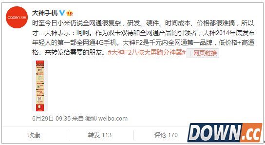 随着FDD牌照的发放,意味着中国通信行业全面进入4G时代,用户对于网络的覆盖、速度也提出了更高的要求。目前单一模式的终端已无法满足用户的需求,全网通用的手机将迎来新一轮大发展,甚至有专家预言,2015年4G终端将全面进入全网通时代。值得一提的是,小米note全网通版正式发售,却受到千元内全网通第一品牌大神手机的强烈狙击。 其实,大神手机狙击小米手机全网通并非主动行为,而是因为小米官方声称全网通技术很复杂。作为全网通技术引领者的大神手机,对于小米的态度,大神在微博上表示,“时至今日小米仍说全网通很复杂,研发、硬件、时间成本、价格都很难搞,所以大神才表示:呵呵。”