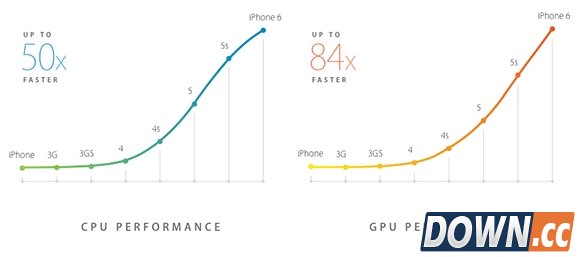 (图片来源:iPhone6发布会PPT) ——大声告诉我你看到了什么?! ...... 好吧,仅仅2007到2014八年的时间,iPhone搭载的处理器性能提升了50倍,等下,我算一会……那可是5000%啊,整整将近10000%啊!GPU性能有84倍的提升,我都快吓哭了好么!