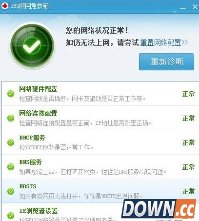 图3 360安全浏览器断网急救箱功能 当出现无法访问的页面时,在页面中单击“360急救箱”按钮(如图3),单击“全面诊断”按钮,360即会对当前用户的网络状况进行诊断,并将相应结果显示在列表中。如果有某一项提示不正常,可以根据提示手工予以解决,或单击对话框上方的“重置网络配置”文字链接,让“360断网急救箱”帮你自动修复,的确十分方便。 |