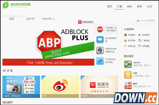 图1:360安全浏览器6.0正式版扩展中心 360浏览器6.0正式版除了保持高强度安全性之外,其亮点之一便是360扩展中心的全面升级。新版浏览器扩展中心新增几十种插件,涵盖了休闲娱乐、生活便利、社交网络、广告过滤、实用工具和网页增强等六大领域,全面丰富网民上网体验。且所有官方应用都经过360改良优化,更加符合中国网民的上网习惯。