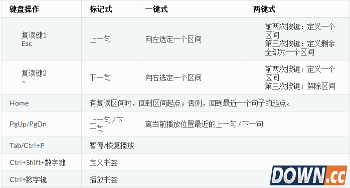 朗读遍数设置成多少合适? 听力很弱,三五遍啥也不懂,三十遍勉强听懂,五十遍勉强听清。可以把朗读遍数调成永远, 如果某句听懂了,果断进入下一句(用鼠标或者快捷键进入下一句)。 自信耳聪目明,两三遍就能听个大概,可以把朗读遍调成固定的三次/五次/十次都可以, 如果某句朗读结束后,自己感觉还不懂,果断回头再听这句(这时可能已经进入下一句,用鼠标或者快捷键返回上一句)。 切换复读方式 标记式: 以句子为复读区间,适合精听。 一键式: 无停顿流畅播放,适合泛听,适合听力已经达到一定水平,能听懂大部分内容,多数时候泛听,偶尔有一两句听不太清楚的句子想回头重复去听的朋友。 两键式: 鼠标左右键定义复读区间,左键定义起点,右键定义终点。 Alt-F : 快速切换复读方式 复读方式的优先级选择 如果课件 制作者 在制作课件时, 预设 了复读方式,那么 使用者 首次 打开课件时,Aboboo 自动选用 预设值; 如果随后 使用者 重新设定了复读方式,以后再打开该课件,就使用 上次设定 的复读方式; 如果课件 制作者 没有预设复读方式,那么 使用者 首次打开课件时,选用 菜单 ‣ 参数设置 ‣ 复读参数 ‣ 默认复读方式 的设定值。 键盘控制
