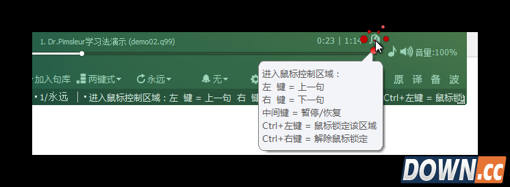 无线鼠标遥控复读 方便特殊场景遥控复读,如笔记本放在讲台上,教师拿着无线鼠标控制复读,或者笔记本留在书桌上,自己躺上床遥控复读。 鼠标移动到“鼠标控制区” Ctrl-左键 锁定控制区,进入“遥控” 鼠标被锁定在控制区域内,不会超出区域,方便您操作: 左键 上一句 右键 下一句 中键 暂停/播放 Ctrl-右键 解除锁定,退出“遥控”
