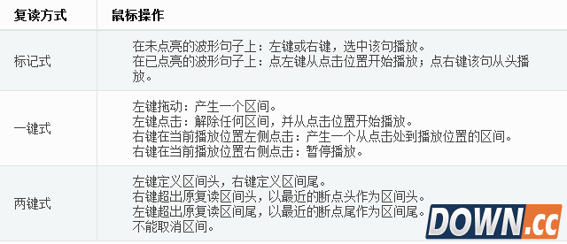 什么是复读? Aboboo复读就是重复播放,让你听清每个音,一遍听不清,就重复一遍,还是听不清,就再重复,直到完全听清。 复读有阶段,不同阶段需要不同的复读方法。 刚开始练习听力,什么都听不懂,每句话都要复读,请使用标记式复读(默认的复读方式)。 什么“标记”呢? 就是句子的开始位置和结束位置,标记式复读就是重复播放两个位置标记出的音频内容(波形图上点亮的部分)。 什么是复读区间? 复读区间就是你要反复听的片段。听力复读训练中,如果不定义复读区间,软件就不会复读。 用标记式复读,不需要手工选择复读区间,正在播放的句子就是复读区间,选择句子就是选择复读区间,切换句子就是切换复读区间。 用一键式和两键式复读时,听得懂就一直往下听,听不懂“倒回去”(用鼠标或键盘动态选定复读区间),反复听,听懂后再解除复读区间,继续往下听。 波形图上点亮的部分就是当前的复读区间,没有定义复读区间时,波形图上就没有点亮的部分。 听力水平一般: 用标记式,正在播放的句子就是复读区间 听力水平较高: 用一键式或两键式,听得懂就一直往下听,听不懂就马上选择没听懂的片段,反复听。 句子选择器 标记式复读时,有些音频含有固定的片头、片尾、音乐、现场采访等,这些内容不用逐句复读,事前用 句子选择器 去掉: