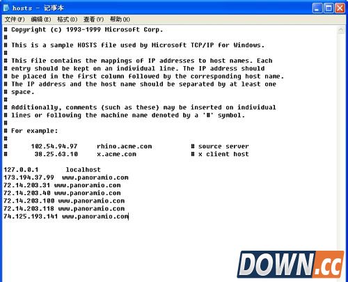 解决方法: 1、需要更改IP地址,打开我的电脑在地址栏里面输入“C:WINDOWSsystem32driversetc”。 2、找到“hosts”这个文件,用记事本打开“hosts”这个文件。 3、删除:"127.0.0.1 localhost"这一行以下后添加的所有网址,保留这一行以上的内容,把下面的地址输入到里面,保存。 127.0.0.1 Localhost 173.194.64.141www.panoramio.com 173.194.46.19 www.google.com 173.194.46.1 kh.google.com 203.208.36.1 kh.google.com 203.208.36.2 kh.google.com 203.208.36.3 kh.google.com 203.208.36.4 kh.google.com 203.208.36.5 kh.google.com 4、重新启动谷歌地球,里面的照片就可以打开了。 |