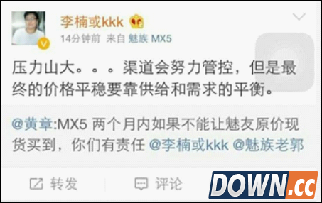 图:李楠微博截图 很明显,黄章的微博确实狠,但对于消费者来说,两个月内能原价买到魅族MX5的话,的确不错。但从李楠的微博语言看来,这是在有难度,高管的吐槽,魅族MX5的产能压力的确不小。