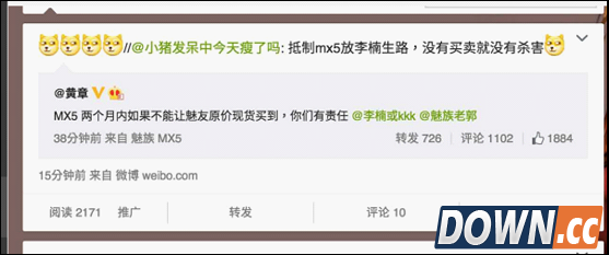 图:微博截图 有网友打趣说,抵制MX5放李楠生路,没有买卖就没有杀害。 后来,有网友发现,李楠删除了吐槽微博。并转发了魅族科技的微博称:从产品到备货到营销,希望大家看到我们的诚意。