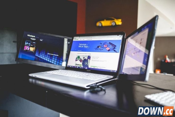 既然分屏是一项酷炫的功能,一个来自比利时的团队准备将分屏玩得酷炫到底了。他们开发了一款多屏扩展设备 SLIDEN'JOY,这款设备安装在笔记本电脑的 A 面,可以折叠和笔记本一起折叠携带,最关键的是,它可以同时扩展成三块屏幕。