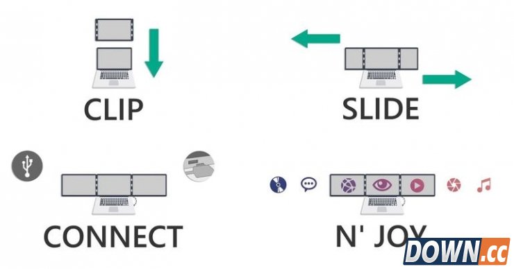 SLIDEN'JOY 吸附固定在笔记本的 A 面也就是笔记本的顶盖上,所以它并不会破坏笔记本的结构,只需要固定—打开—连接三个步骤就可以完成安装。SLIDEN'JOY 通过 USB 3.0 或者两个 USB 2.0 接口连接笔记本输出,从视频来看可能直接可以通过 USB 接口供电,不需要额外的电力供应接口。