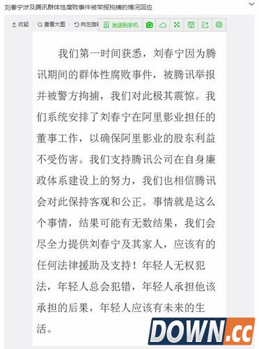据阿里巴巴官方微博消息,今早阿里巴巴回应刘春宁涉及腾讯群体性腐败事件被举报拘捕的情况,表示将会全力提供刘春宁及其家人应有的法律援助及支持。阿里影业公告称,公司董事会注意到,公司执行董事刘春宁先生因涉嫌于过往在腾讯科技有限公司任职期间收受贿款而被中国大陆公安局拘留作调查,有关调查与其在阿里巴巴集团有限公司或本公司的现有职务概无关系。