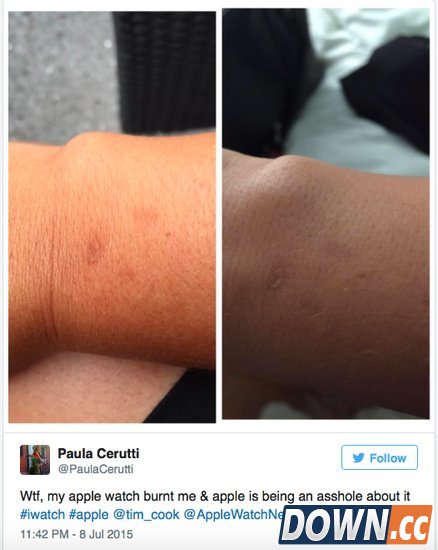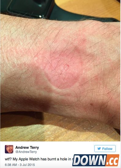 可穿戴设备拉近了我们与科技的距离,但正因如此,也有可能给我们带来意外的伤害,甚至灼伤你的皮肤。多名Apple Watch用户最近就报告了这类问题。 一位名叫波拉·塞鲁蒂(Paula Cerutti)的Apple Watch用户对新闻网站Fusion表示,在佩戴了大约1小时Apple Watch后,她开始感觉有东西灼烧自己的手腕。她发现原来是Apple Watch运动版系得太紧,于是,她松了松表带,多腾出一些空间。但当天晚些时候,塞鲁蒂发现佩戴Apple Watch的地方起了一个水泡,而Apple Watch当时已经很烫了。 她在Twitter上抱怨此事,还配上了图片。而当她向苹果汇报此事时,苹果并没有给与任何帮助。