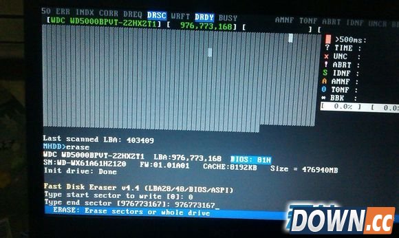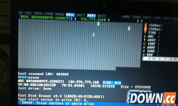1、如果坏道较少,我们可以用MHDD软件对坏道尽心屏蔽,可以得到意想不到的结果,下面以我的WD500G笔记本为例,进行硬盘坏道屏蔽 ![]() 2、这是我的笔记本近期内所出现的状况,开机进行硬盘自检,硬盘自检有过不去,需要在自检前按空格键才能正常进入系统 这时,我们就可以用MHDD扫描下硬盘,检测一下硬盘状况。 现在的PE里自带的工具箱里自带的都有MHDD硬盘检测工具,在此要注意的是,一定要在主板BIOS里检查一下硬盘模式,看是AHCI模式还是IDE模式,MHDD是无法在硬盘为AHCI模式的情况下扫到硬盘的 ![]() 3、保存BIOS设置,重启按F12进入启动项选择界面 ![]() 4、选择1,也就是我的U盘,这就不用多说了,只要重装过系统都知道怎么做 ![]() 5、运行硬盘内存检测扫描工具菜单 ![]() 6、运行MHDD硬盘检测 ![]() 7、图不太清,不要以为你们撸多了眼花了,是我手抖了,这里不用动,直接敲回车 ![]() 8、可以看到,选项8就是我的WD500G,按下8,敲回车,出现了此界面 ![]() start LBA 填入你硬盘坏道的起始扇区 end LBA 填入你硬盘坏道结束扇区。 Remap 选为 ON 表示开启修复功能。 Timeout 为时间 一般是默认。 LOOP/test REPAIR 设置为ON 表示开启这里是反复擦写可以修复玩固坏道。 ERASE 为OFF 表示关闭。 9、设置完成,按F4 开始修理了。 想要治病,就得先看病,直接按F4进行全盘扫描! ![]() 10、进入了硬盘扫描界面,每个长方块代表255个扇区(在LBA模式下)或代表63个扇区(在CHS模式下);扫描过程可随时按ESC键终止;方块从上到下依次表示从正常到异常,读写速度由快到慢。正常情况下,应该只出现第一个和第二个灰色方块;如果出现浅灰色方块(第三个方块),则代表该处读取耗时较多;如果出现绿色和褐色方块(第四个和第五个方块),则代表此处读取异常,但还未产生坏道;如果出现红色方块(第六个,即最后一个方块),则代表此处读取吃力,马上就要产生坏道;如果出现问号?,则表示此处读取错误,有严重物理坏道,无法修复。如果出现红色的X,则表示此处读取错误,有坏道,可以修复,也可以屏蔽。 ![]() 11、在检测前,一定要备好纸和笔,记好硬盘坏道的位置,如果硬盘坏道稍多,在右下角是显示不完的。如图,坏道位置在91545 ![]() 12、等硬盘扫描结束后,按F4出现界面,选择第一项,选择start lba,输入90000,然后选择remap,敲回车,把选项调成ON,remap就是把坏道加入坏道区间表,屏蔽坏道的速度是很快的,看不到屏蔽过程就屏蔽完了,依照此法,把剩余坏道同样屏蔽 此法只用于坏道较少的硬盘,而且屏蔽坏道后往往会出现意料不到的结果,最后别忘了在主板BIOS里把硬盘模式改为AHCI模式!!! MHDD低格方法 1、硬盘低格对解决某些问题有用,如恶性病毒、逻辑坏道 ![]() 2、按esc键,出现此界面,然后输入erase确认 ![]() 3、输入0,确认。 4、然后MHDD就会对电脑硬盘的坏道进行修复。 |