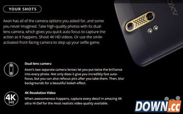 如之前我们提到过的一样,这款手机背部配备了双摄像头,该手机的主摄像头采用Sony IMX230传感器,副摄像头则采用了Sony IMX214传感器,这个双摄像头可以让你拍摄4K视频,并提供令人难以置信的快速自动对焦。当然,许多人会说HTC One M8也配备了双摄像头,他们都对此嗤之以鼻,觉得效果非常一般,希望Axon Phone配备的双摄像头可以带给我们一些不一样的体验。