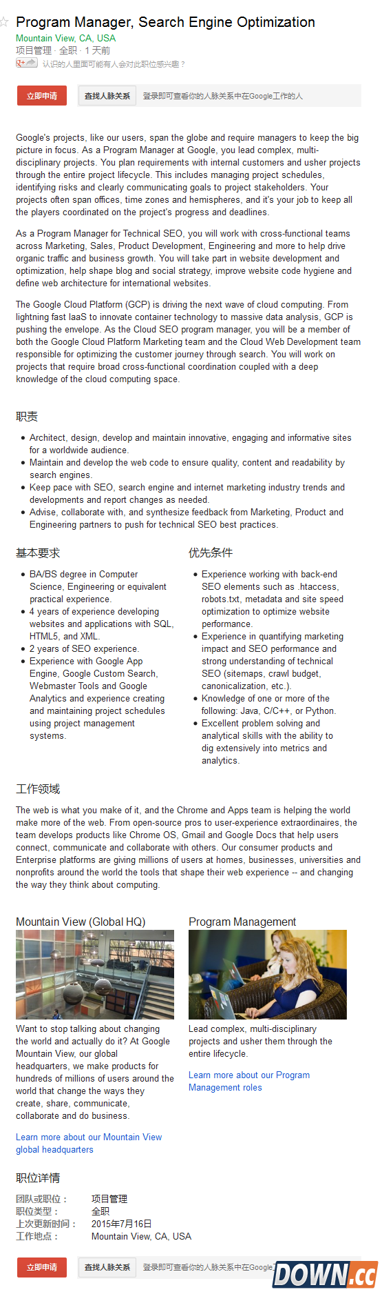谷歌正招募一名SEO专家。今天谷歌更新的招聘公告中新增“项目经理,搜素引擎优化”的新岗位需求,岗位描述中写道:“该岗位为技术SEO的项目经理,入职后隶属于跨功能团队负责市场营销、销售、产品研发和工程监督,而更为重要的是帮助企业驾驭和组织管理流量和业务增长。你将参与到网站研发和优化中,并帮助撰写博文和社交策略,改善网站代码健康并为国际网站定义网络体系结构。”