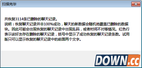 9. 稍等片刻后,软件将弹出窗口提示成功恢复的聊天记录条数,如下图所示,成功恢复了3114条已删除的微信聊天记录。