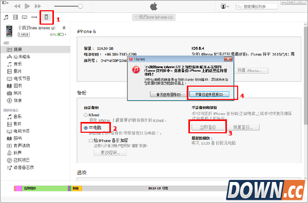 要完成微信聊天记录恢复,总的来说我们需要做两步操作,首先需要将微信聊天记录从手机上导出到电脑上,然后使用微信聊天记录恢复软件对删除的内容进行恢复。下面我将一步一步告诉你如何恢复已删除的微信聊天记录。 1. 我们需要先运行Itunes软件,并将手机与电脑进行连接,然后依次点击Itunes窗口左上角的手机图标,然后选择“本电脑”并点击“立即备份”按钮,然后在弹出的窗口中点击“不备份应用程序”,如下图所示,我们只需依次点击1,2,3,4处红框所标示的位置即可。