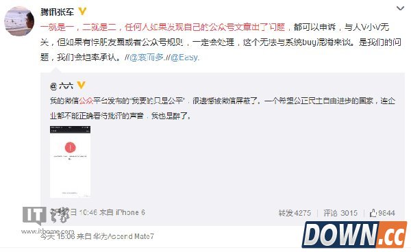接着,腾讯公司公关总监张军通过微博回应称:“很抱歉,您的文章由于系统bug导致被误删,我们在收到消息后11时40分立刻进行了后台核查,并恢复了文章。对此造成不便,还请谅解!后续如果遇到问题,可以直接在通知入口进行申诉,我们会及时处理。给您造成困惑,再次抱歉!” 让人没想到的是,张军这条回应随即又被删除。在今天时,张军再次发表微博称:“一就是一,二就是二,任何人如果发现自己的公众号文章出了问题,都可以申诉,与大V小V无关,但如果有悖朋友圈或者公众号规则,一定会处理,这个无法与系统bug混淆来谈。是我们的问题,我们会坦率承认。”