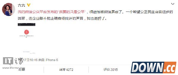 随后六六将这篇文章发到微信平台,谁知却遭到了微信的屏蔽。对此,六六昨日发表微博称:“我的微信公众平台发布的“我要的只是公平”,很遗憾被微信屏蔽了。一个希望公正民主自由进步的国家,连企业都不能正确看待批评的声音,我也是醉了。”