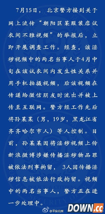 日前,一对青年男女在试衣间内进行性爱行为的不雅视频在网上流传,北京警方于7月19日晚间通报称共4人因此事被拘留。北京京润律师事务所律师韩骁称,传播淫秽物品罪的孙某某或将因此事获刑,其余三人将因情节不同面临拘留处罚。