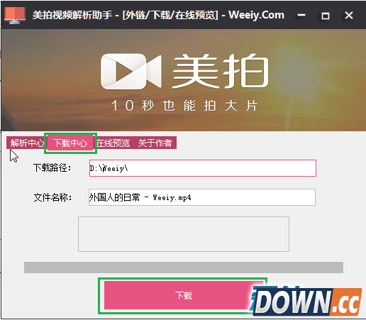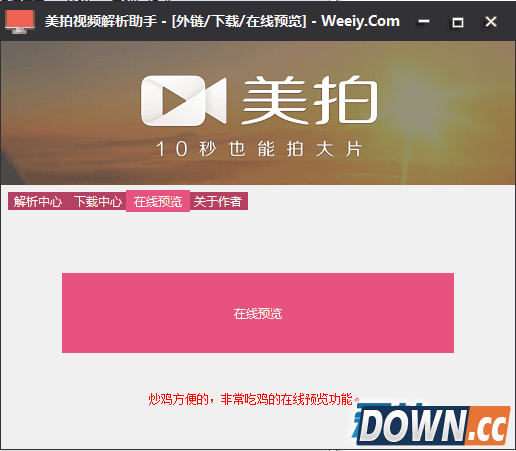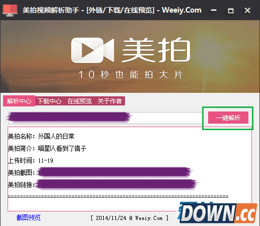 美拍视频解析助手:能够解析美拍网视频的真实地址。美拍视频解析助手,可以解析美拍网视频的真实地址,支持把美拍视频下载保存到电脑上,也可以在线预览观看美拍视频,在电脑上玩儿美拍视频的好助手。 美拍视频解析助手使用教程 下载解压后,运行 美拍视频解析助手.exe,打开软件 把美拍视频的网址复制到工具里,然后点击“一键解析”按钮,就能得到视频名称、简介、截图和下载地址等信息