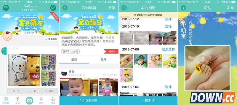 点击宝宝主页首部的活动栏,进入到活动区,在这里您可以查看所有参与活动萌宝宝们,点击“我要参加”,进入本地相册选择手机里最不舍得删的宝宝照片,一定要选够6张才可以哦,选好之后一键生成宝宝影集,您可以预览一下效果,点击发布就可以啦,独特又富有纪念意义的宝宝相册就这样诞生,是不是很简单方便呢?