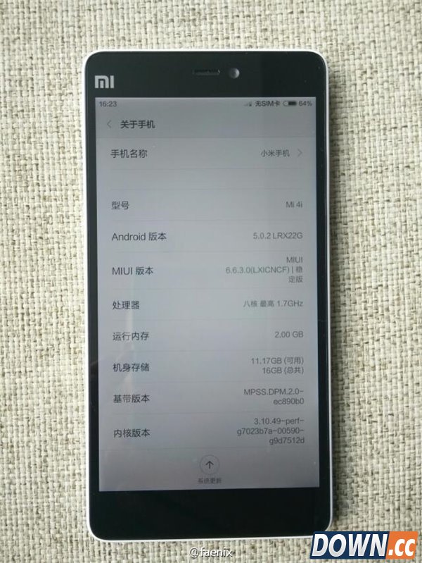 7月27日消息 6月中旬小米4i国行版现身工信部,此后这款手机便鲜有消息。今日,有微博网友曝光了小米4i国行版的真机,我们一起来看一下。
