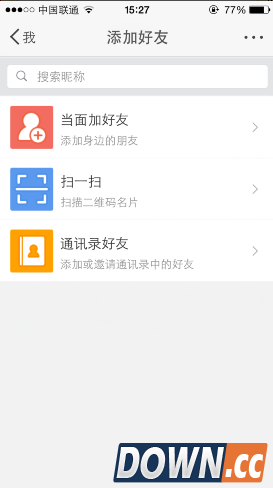 2、在添加好友中,我们可以看到有四种添加方式,分别是搜索昵称、当面加好友、扫一扫以及通讯录好友;