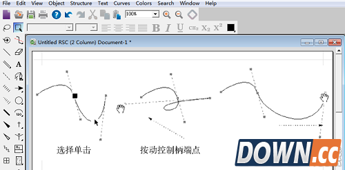ChemBioDraw两种子笔工具所做图形比较 改变用笔工具绘制曲线的方法: 1、选择【笔】工具,单击曲线,原来绘制时的各条方向线及控制柄都重现;【注意】此时曲线端点的控制柄是与端点相连的,此状态称之为”改变绘制状态”; 2、按动曲线上的任一控制柄或端点,都可以改变连接曲线的形状和弯曲度。