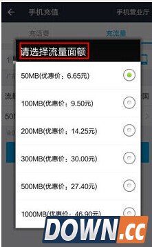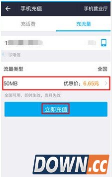 三、选定充流量的手机号后,还可以点击左图流量数和价格的地方,进入“请选择流量面额”页面,进行充值流量和价格的选择,选好后点击“立即充值”。