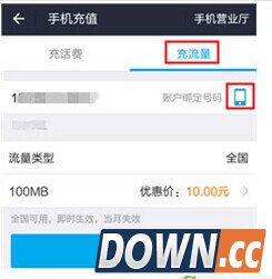 二、在“手机充值”页面,点击“充流量”。这里默认充流量的号码为账户绑定号码,如果想为他人充流量可以点击号码右侧的手机样式的图标,更换充流量的手机号码。