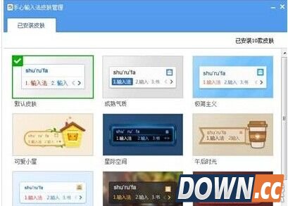 3、手心输入法支持换肤功能,提供了皮肤管理界面,所有皮肤一目了然。内置了十款精美皮肤,更多皮肤正在制作中,会陆续推出