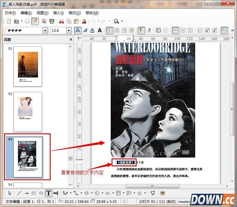 步骤3:需要修改的pdf文件添加完成后,大家就可以在软件中看到打开的pdf文件。此时用户就可以对pdf中已有的文字、图片信息进行编辑了,比如增加删除文字,修改文字颜色、大小、间距等。这里我们需要在软件左侧选定修改的pdf文件页面,然后在右侧显示的页面中移动鼠标选中需要进行编辑的文字内容部分,如图: