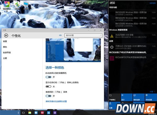 在Win10中,透明效果从开始菜单/开始屏幕扩展到了任务栏和通知中心。控制透明效果的开关这项功能可以在新版“个性化”中实现“一键”开关。