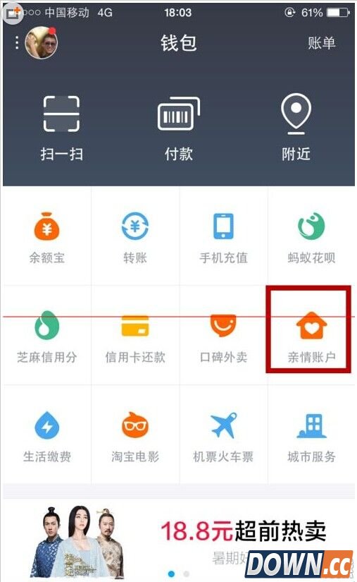 1、打开手机支付宝钱包,进入到支付宝钱包首页,点击进入“亲情账户”;
