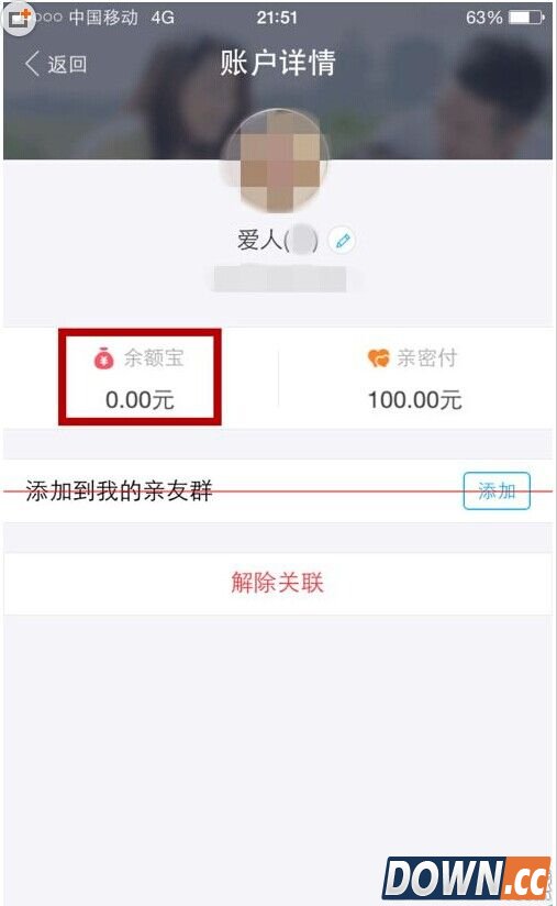 3、在关联的亲情账号里,有对方账户的基本信息,包含余额宝和亲密付,可以看到余额宝金额为0,点击一下“余额宝”;